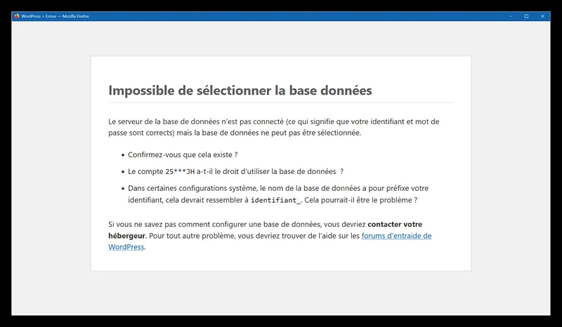 Panne générale – Le changement d'un thème, l'ajout d'un plugin ou une simple mise à jour de WordPress peuvent parfois entraîner une panne complète. Le site affiche alors des lignes de code sur toutes les pages ou, dans le pire des cas, il est remplacé par une page blanche ou une page d'erreur indiquant qu'un problème est survenu (voir image en fin de page).